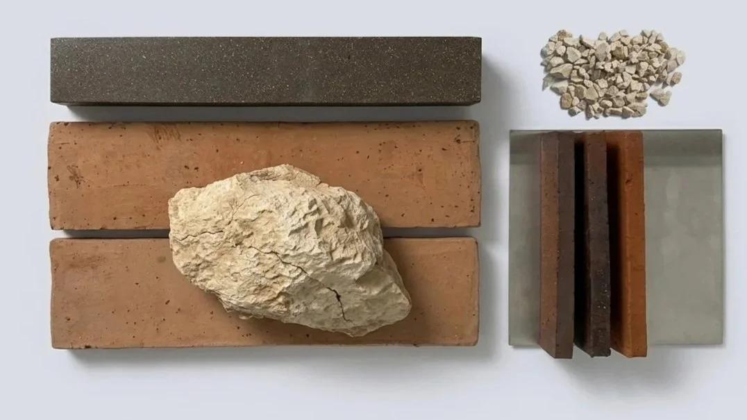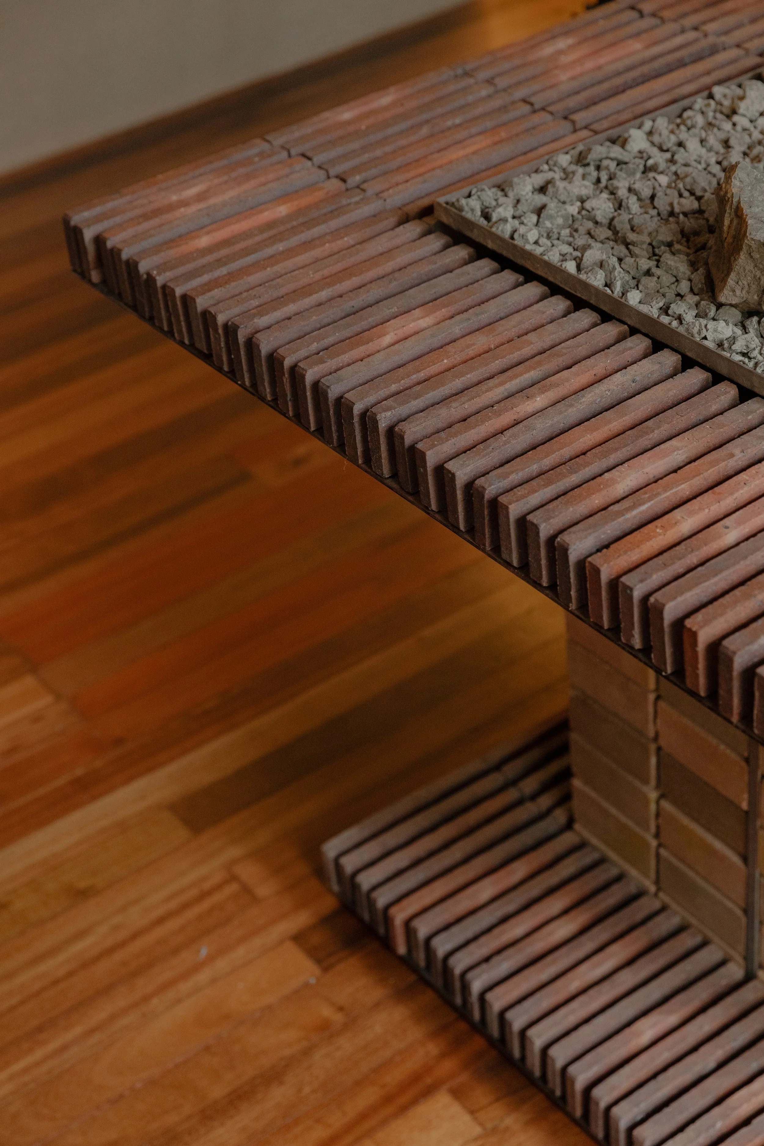 Jardín mineral es la propuesta de ar_ea para el diseño del estudio -home office-, desarrollada a través de la experimentación con el ladrillo como material predominante. La propuesta explora las posibilidades espaciales, constructivas y sensoriales de la arcilla, entendida no solo como un elemento constructivo, sino como el origen matérico del proyecto. Entre capas, el centro de la mesa alberga un jardín mineral compuesto por fragmentos de arcilla extraídos directamente de la mina y dejados secar de forma natural, sin intervención, bajo la idea de usar el material en su forma natural y revelar su origen, tal como viene de la tierra. Jardín mineral es la materialización de la exploración formal y constructiva a través de patrones, formatos, acabados y disposiciones diversas de productos derivados de la arcilla: ladrillos prensados modulados, apilados con junta perdida; tejas de piso dispuestas en vertical y rotadas a 45°; ladrillos macizos usados verticalmente; y piezas de fachada utilizadas tanto en disposición vertical como horizontal. La propuesta se concentra en dos elementos fundamentales y complementarios: un muro-celosía como componente vertical y una mesa-escritorio como elemento horizontal.
