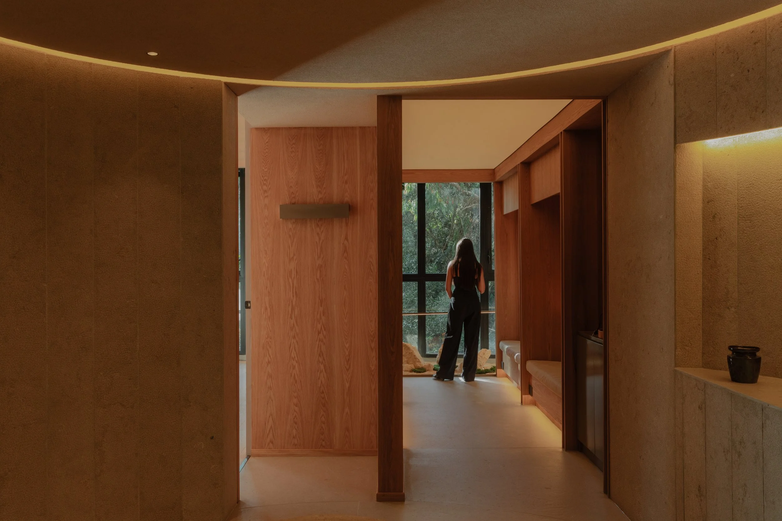 La materialidad está dominada por la piedra, la madera y la luz indirecta. No hay ornamentos, solo una estética basada en texturas, líneas limpias y el peso visual de los materiales. La piedra forma muros circulares y elementos del mobiliario, estableciendo un diálogo entre lo geológico y lo construido.