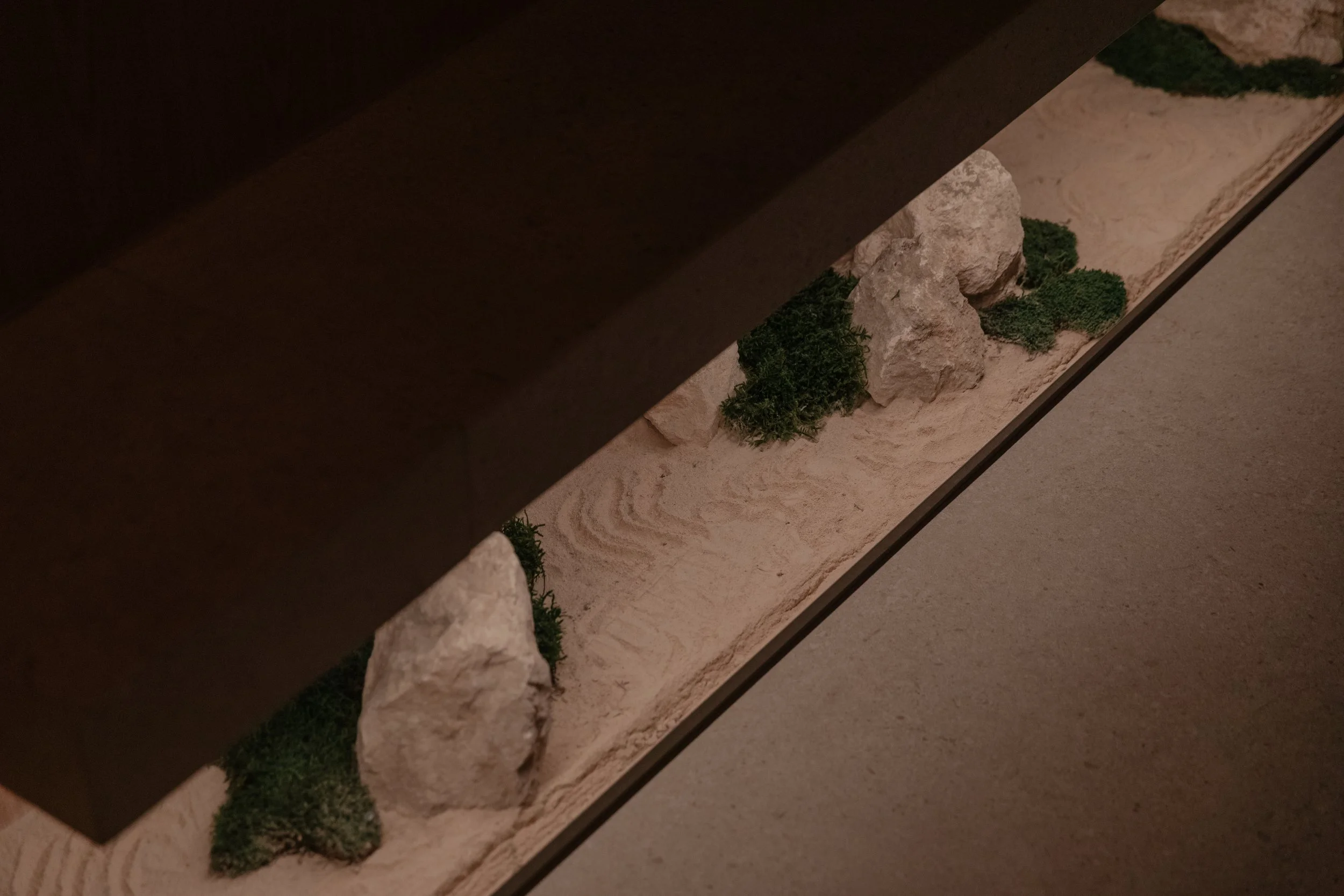 El espacio se recorre a través de una serie de jardines que no funcionan como ornamentos, sino como parte activa de la experiencia. Cada jardín busca desacelerar el paso y preparar al visitante para el interior. El jardín de piedra y musgo, inspirado en los karesansui japoneses, emplea rocas y arena en composiciones abstractas sin plantas. El jardín sonoro, por su parte, centra la atención en el oído: el agua no se ve, se escucha, mediante un goteo constante sobre piedra que crea una atmósfera auditiva de contemplación. En Garden of the Soul, cada elemento construye una experiencia sensorial que conecta cuerpo, mente y paisaje.
