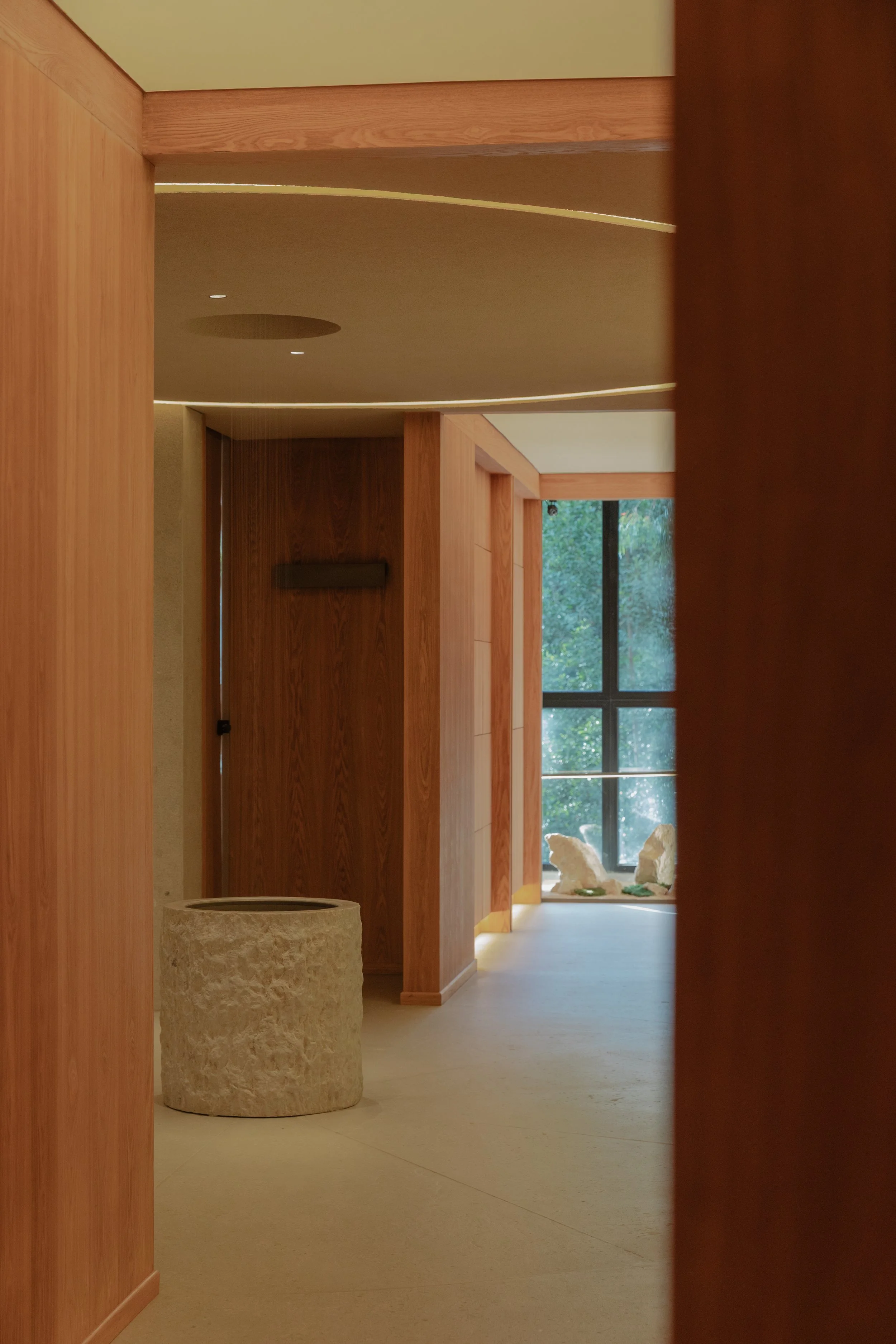 El recorrido inicia con un túnel de madera y luz tenue que guía al visitante hacia el interior. Este pasaje prepara al cuerpo y a la mente para la experiencia contemplativa. Al ingresar, se encuentra un pasillo rectangular interrumpido por una circunferencia de piedra natural con un cuerpo de agua en su centro, que actúa como elemento visual, simbólico y climático, regulando temperatura y sonido.