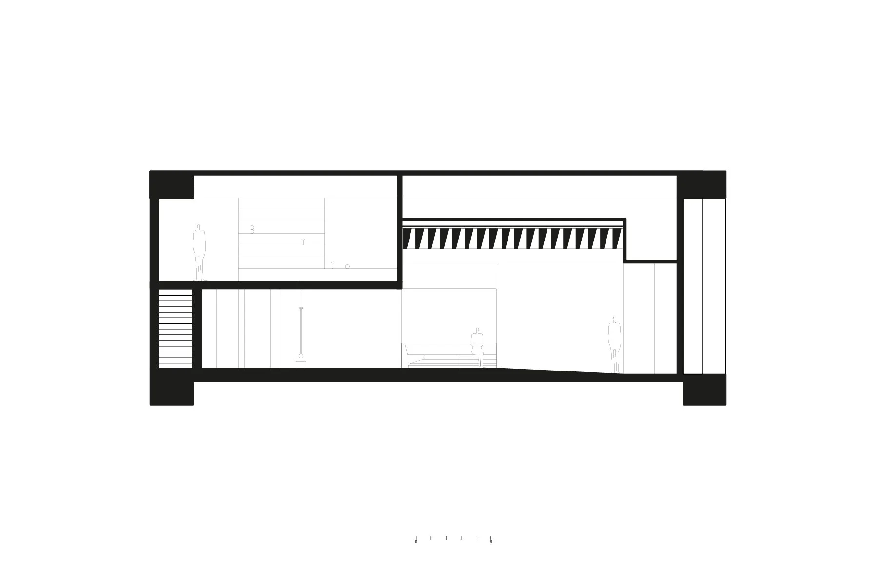 La distribución se inspira en la “diamond configuration” del arquitecto John Hejduk, basada en la rotación de 45 grados de elementos respecto a un sistema ortogonal. Univherse parte de una planta rectangular dividida por tres líneas de cuadrícula, organizadas por seis columnas de concreto. Este sistema permite jugar con la rotación de muros divisorios para crear una espacialidad diversa que se adapta a los diferentes usos, promoviendo el recorrido y la apropiación del espacio por parte del usuario.